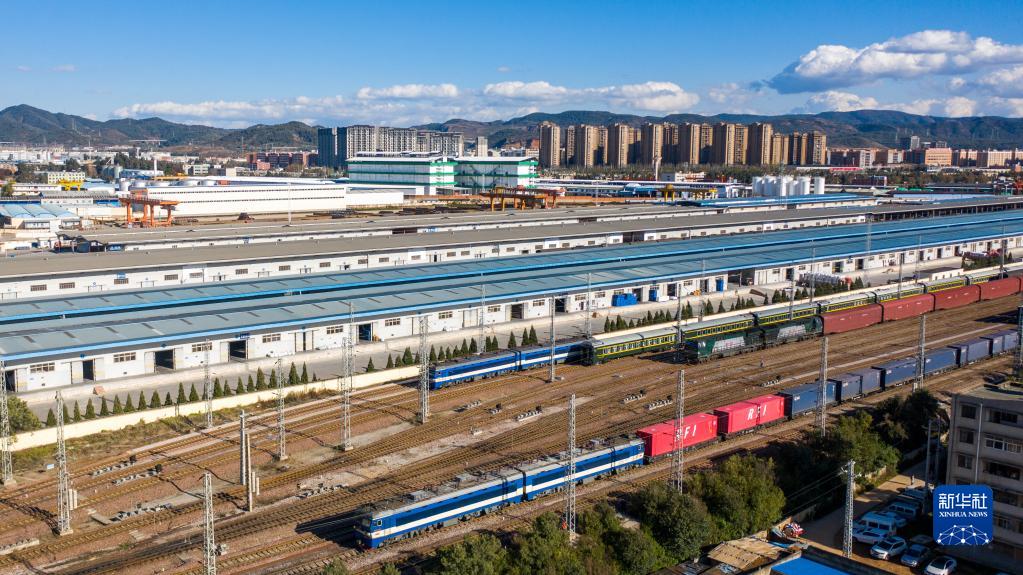 1月1日,滿載30個標準集裝箱的中老鐵路新年首趟國際貨物列車(前)從昆明開往老撾萬象(無人機照片)。新華社記者 胡超 攝