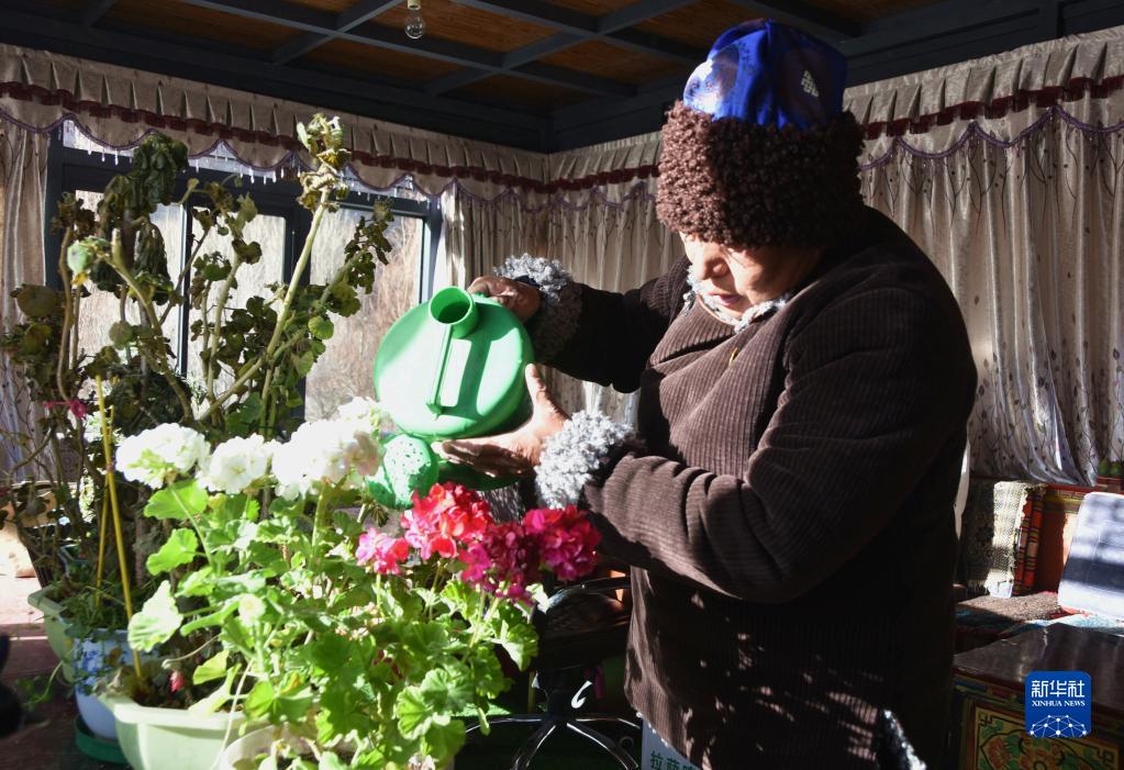 西藏洛扎縣嘎波社區扎麥村村民達瓦次仁在給陽光房里的盆栽澆水(1月19日攝)。新華社記者 陳尚才 攝