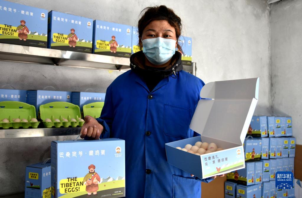 西藏洛扎縣次麥藏雞養殖合作社工作人員在展示特色產品藏雞蛋(1月19日攝)。新華社記者 陳尚才 攝