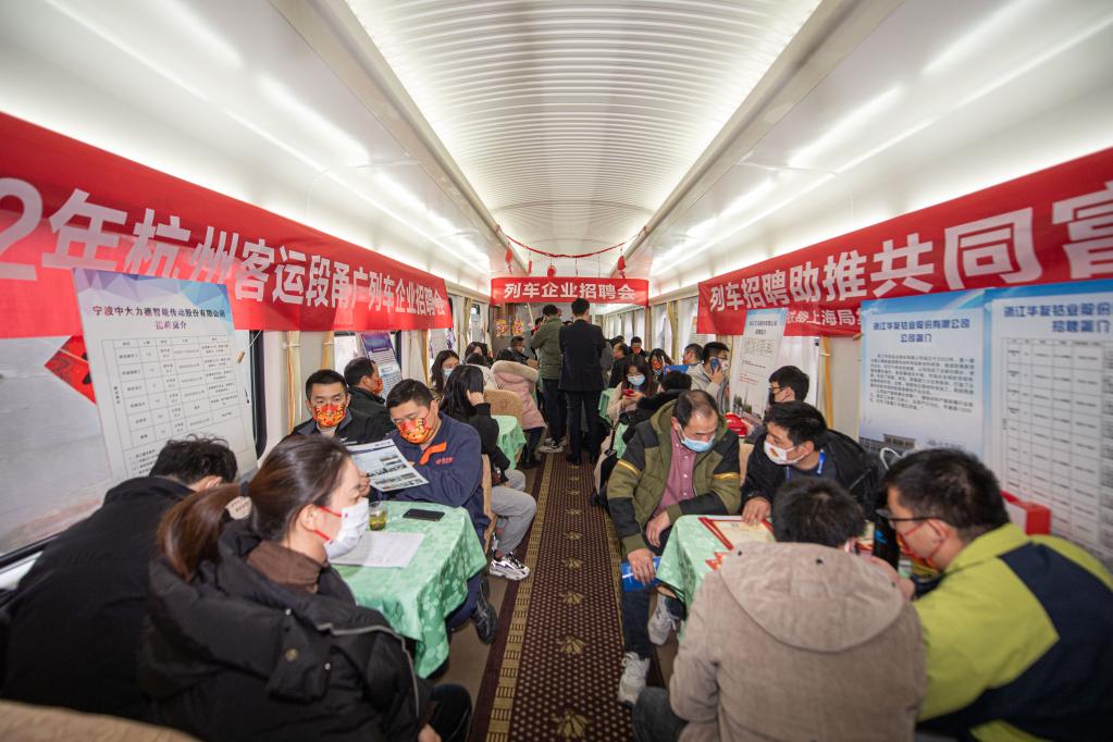 這個想法得到浙江省總工會以及寧波、衢州、湖州等地政府和企業的支持。據悉,今年已是杭州客運段連續第二年在列車上舉辦招聘會。今年這場招聘會共有9家企業提供56個工種、4269個崗位。