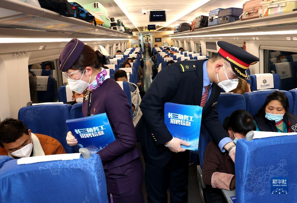 2月12日,列車乘務員在重慶開往上海的G1334次列車上,向春運返程務工人員發放招聘信息。新華社記者 陳飛 攝