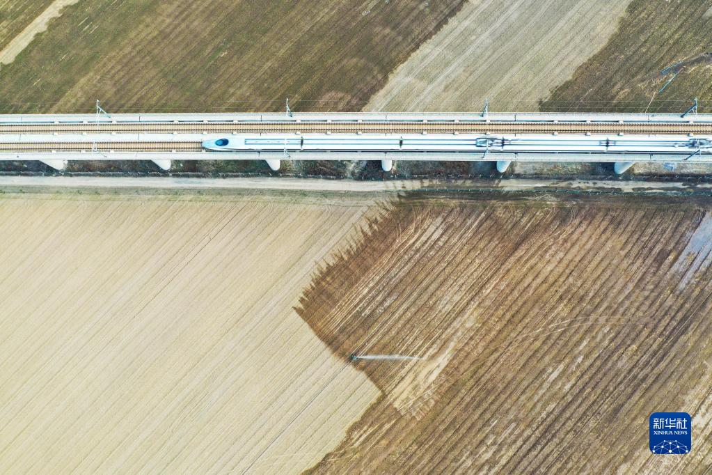2月22日,高地隙植保機在山西省運城市芮城縣新村作業(無人機照片)。新華社記者 柴婷 攝