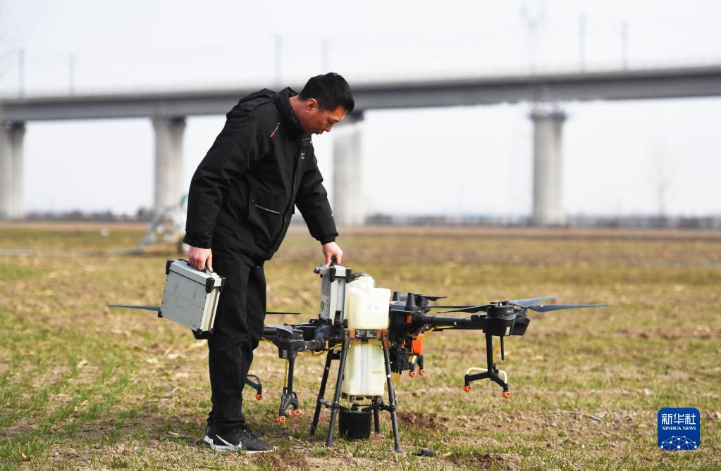 2月17日,在河南省安陽市湯陰縣伏道鎮,農技人員為植保無人機更換電池。新華社記者 張浩然 攝