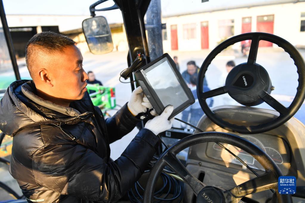 2月21日,在山西省運城市芮城縣東恒農機專業合作社,技術人員在給農機安裝自動駕駛系統。新華社記者 柴婷 攝