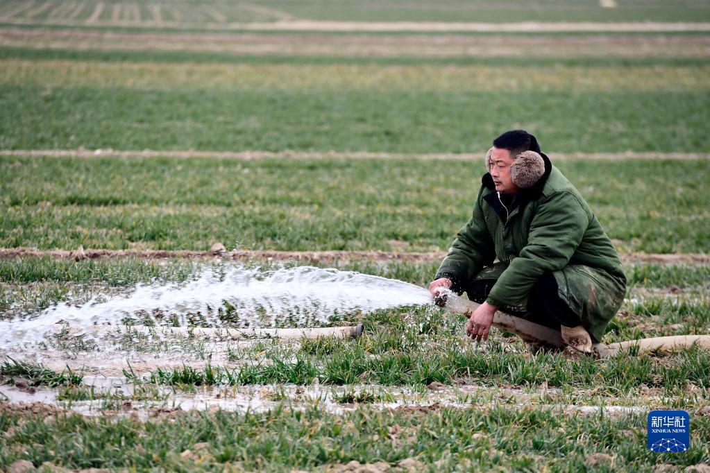 2月18日,在山東省菏澤市巨野縣柳林鎮,村民在麥田里澆水。新華社記者 郭緒雷 攝