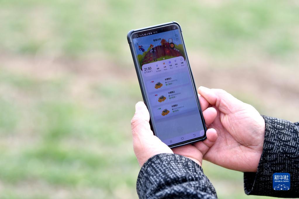2月11日,安徽省亳州市譙城區趙橋鄉“無人農場”工作人員通過手機查看水肥系統運行狀況。新華社記者 劉軍喜 攝
