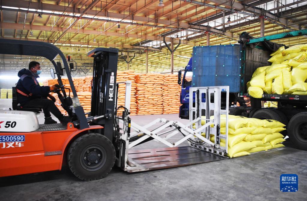 2月17日,工人在位于河南省安陽市湯陰縣伏道鎮的河南萬莊安陽物流園裝運儲備化肥。新華社記者 張浩然 攝