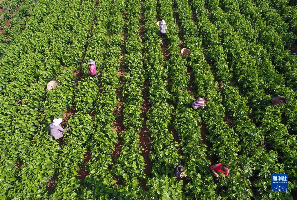 云南尋甸縣金所街道草海子村的農婦在采摘蠶桑葉(2020年5月16日攝,無人機照片)。當地大力發展蠶桑等特色種養殖和加工產業,帶動農民脫貧增收致富。新華社記者 楊宗友 攝