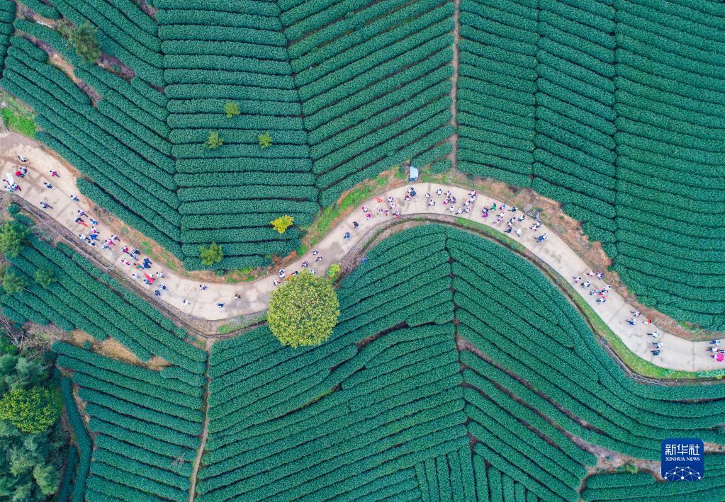 團隊游客在杭州市富陽區拔山村萬畝茶山游覽(2018年3月26日攝,無人機照片)。浙江省“千村示范、萬村整治”工程撬動了鄉村從美麗生態到美麗經濟,再到美好生活的良性循環。2018年,浙江“千萬工程”獲得聯合國“地球衛士獎”中的“激勵與行動獎”。新華社記者 徐昱 攝