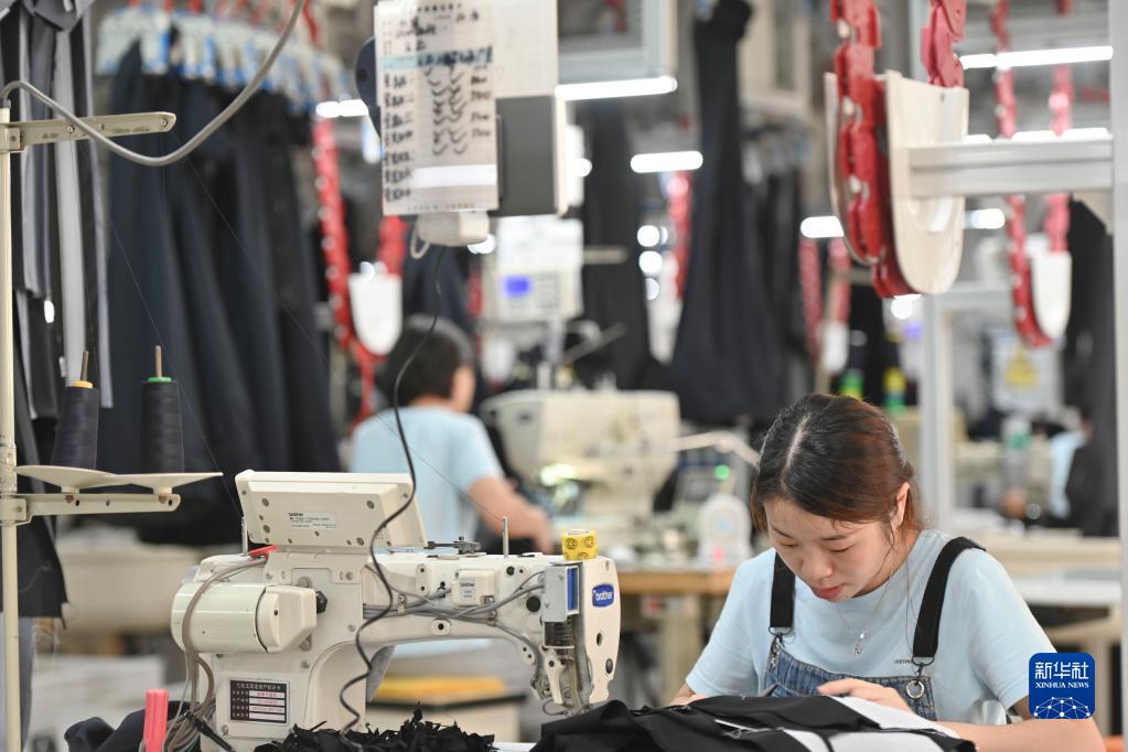 在位于福建省泉州市經濟技術開發區的九牧王西褲智能化生產車間,工人在自動化西褲吊掛流水線上作業(2021年7月30日攝)。近年來,泉州市稅務部門積極落實減稅降費,出臺一系列穩定工業、扶持外貿、鼓勵企業研發創新的政策,服務實體經濟發展。新華社記者 宋為偉 攝