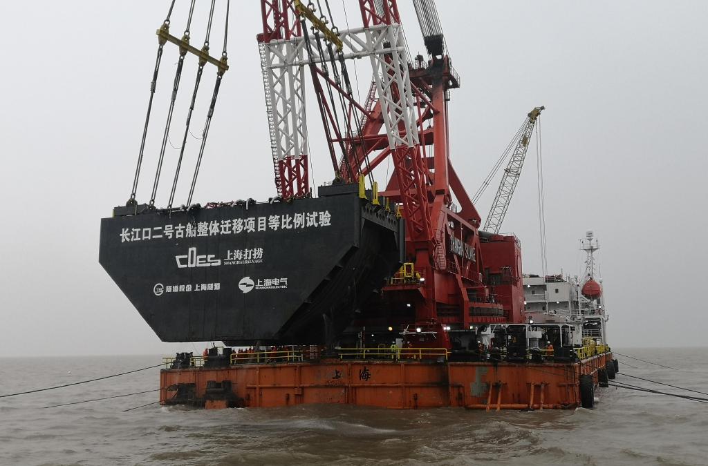 第一步,打撈人員從打撈船上把端板頂梁組合體吊入長江口水下,沉入泥中預設位置;