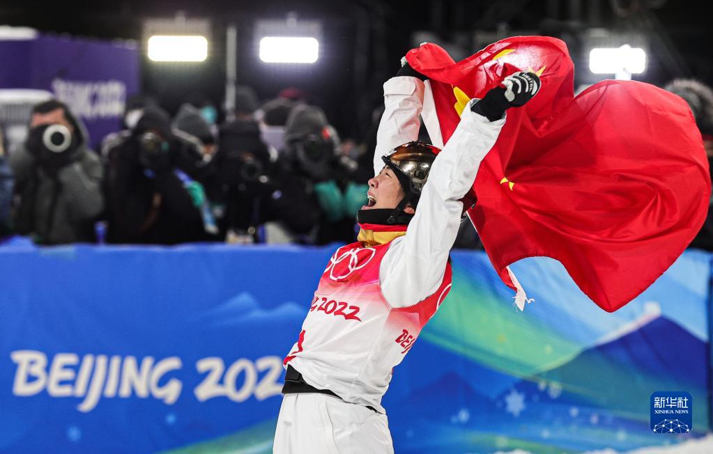 圖為中國選手徐夢桃在北京2022年冬奧會自由式滑雪女子空中技巧決賽后慶祝(2022年2月14日)。新華社記者 吳壯 攝