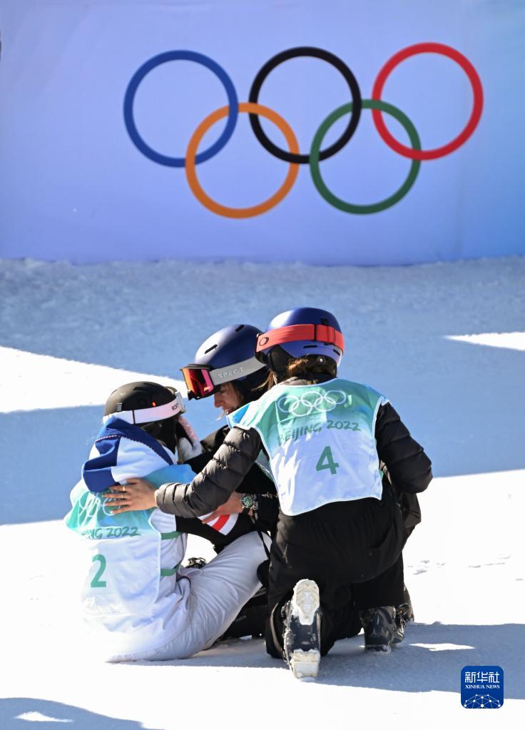 圖為在北京2022年冬奧會自由式滑雪女子大跳臺決賽后,中國選手谷愛凌(右)和瑞士選手瑪蒂爾德·格雷莫德(中)安慰法國選手苔絲·勒德(2022年2月8日攝)。新華社記者 武巍 攝
