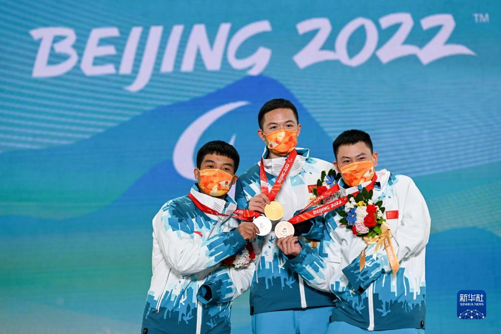 3月7日,中國選手冠軍紀立家(中)、亞軍王鵬耀(左)和季軍朱永鋼在北京2022年冬殘奧會殘奧單板滑雪男子障礙追逐(UL級)比賽獎牌頒發儀式上。新華社記者 胡超 攝