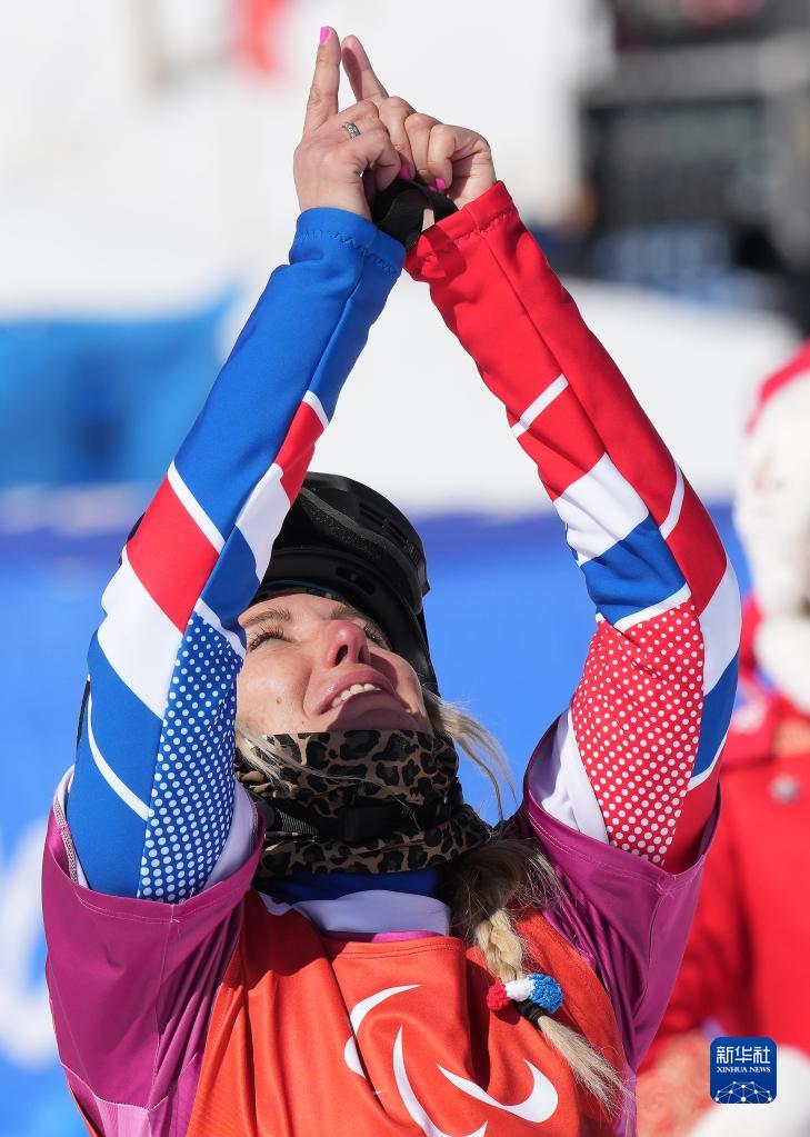 圖為法國選手塞茜爾·埃爾南德斯在北京2022年冬殘奧會殘奧單板滑雪女子障礙追逐賽后慶祝(2022年3月7日攝)。新華社記者 萬象 攝