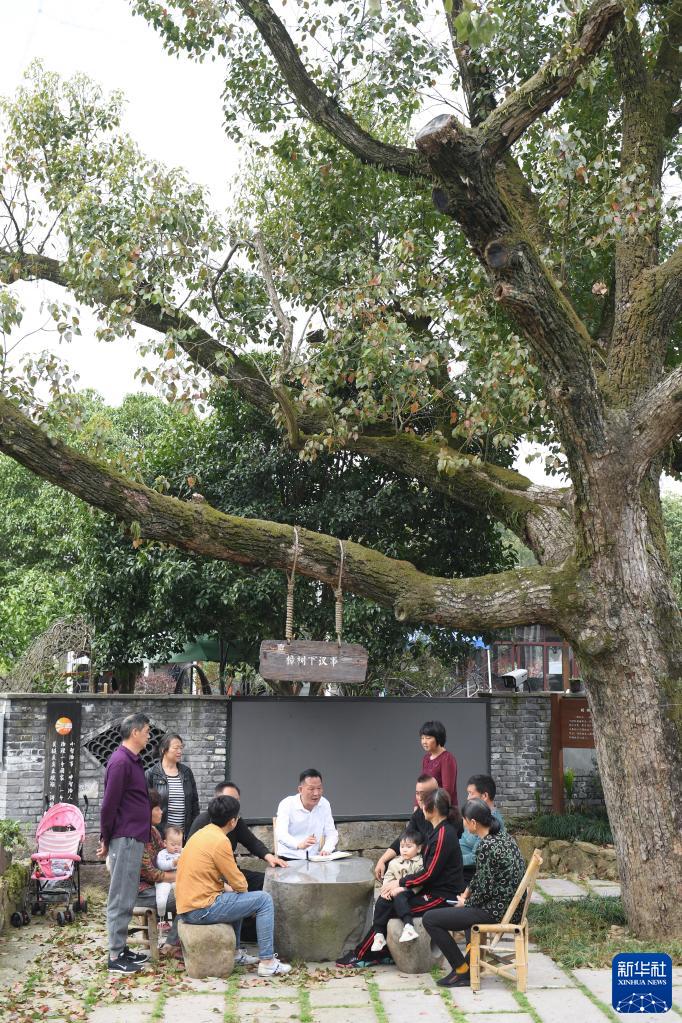 3月14日,杭州市余杭區小古城村一株老樟樹下,村民在商議鄉村發展事項。新華社記者 翁忻旸 攝