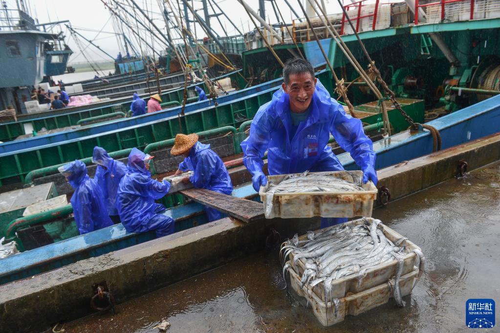 臺州市三門縣健跳漁港碼頭,漁民從歸港的漁船上卸下漁獲(2021年9月12日攝)。新華社發(林利軍攝)