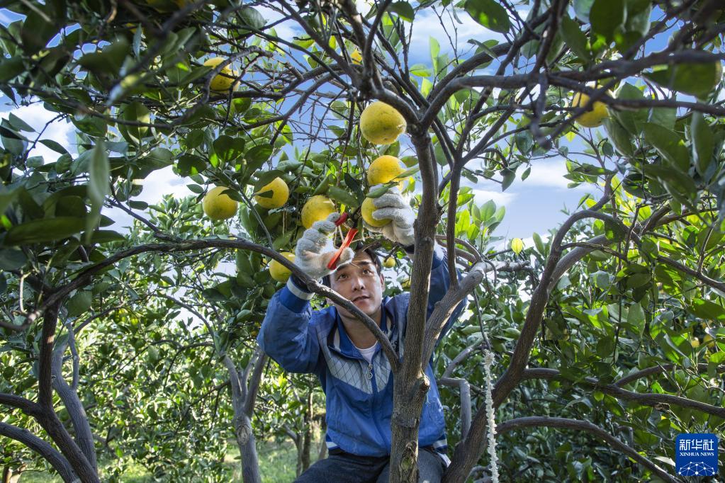 果農在浙江省衢州市常山縣太公山胡柚基地采摘胡柚(2021年11月10日攝)。新華社發(陳勤幸攝)