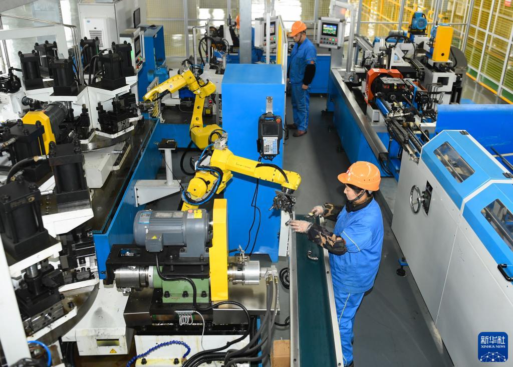 在位于湖州市吳興區八里店鎮的金洲管道科技股份有限公司,工作人員和智能機器人協作生產不銹鋼管件(2月14日攝)。新華社記者 翁忻旸 攝