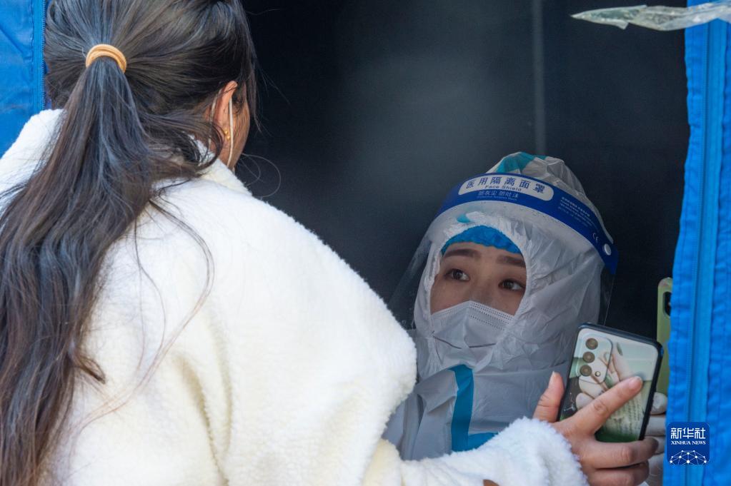 醫務人員在哈爾濱中央大街一核酸采樣點進行核酸采樣(3月20日攝)。新華社記者 謝劍飛 攝
