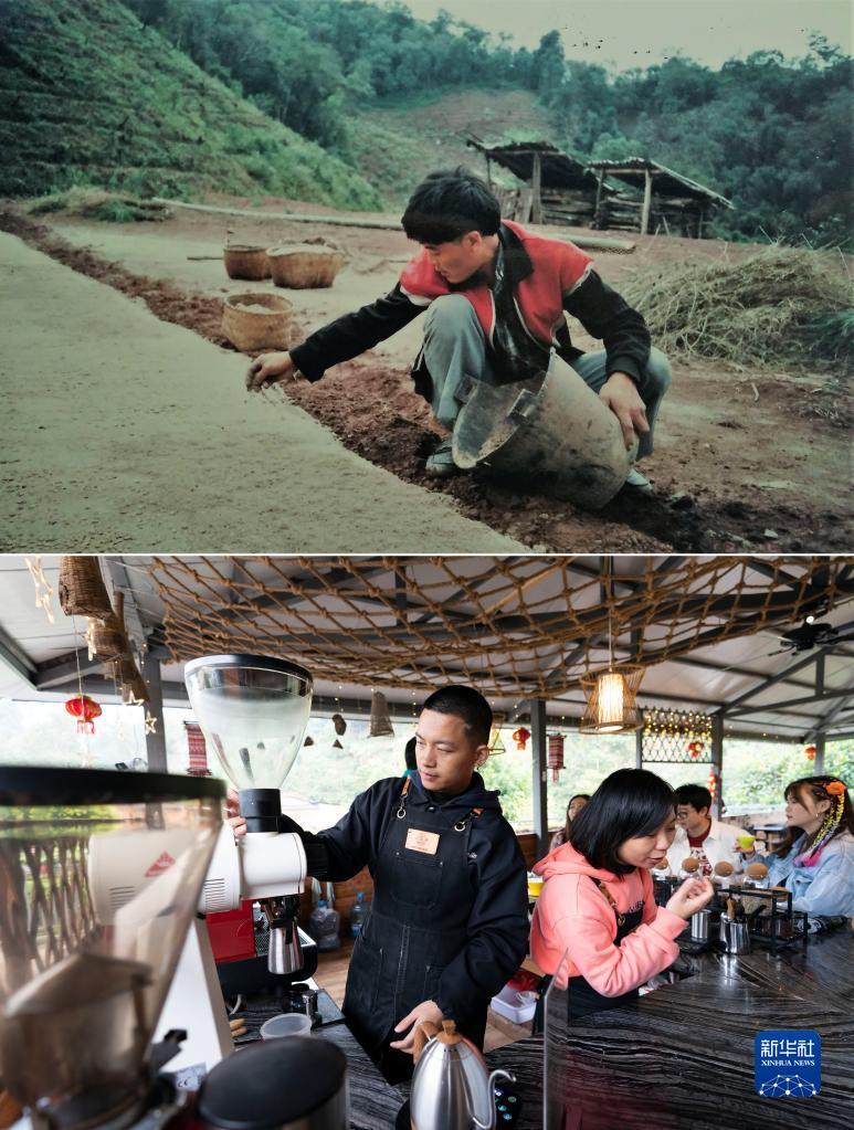 拼版照片:上圖為村民在云南普洱市思茅區小凹子咖啡莊園內進行咖啡育苗(資料照片,1997年攝);下圖為咖啡師(左)在云南普洱市思茅區小凹子咖啡莊園內制作咖啡(新華社記者陳欣波2月22日攝)。新華社發