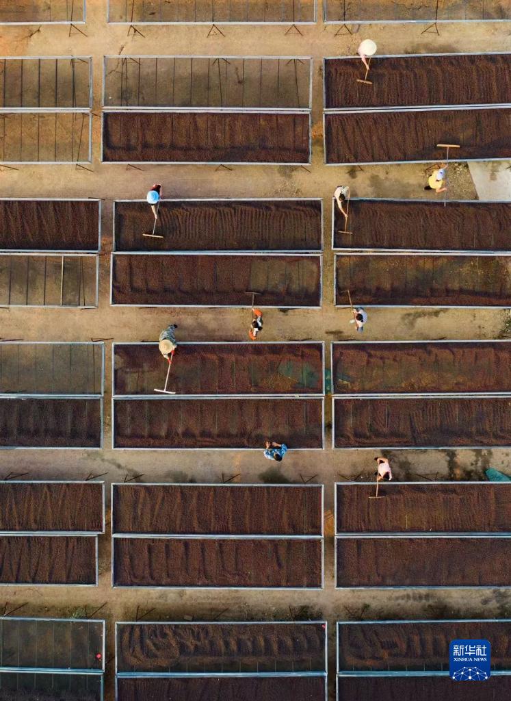 這是云南普洱市思茅區一家企業的咖啡曬場,工作人員在翻曬咖啡(資料圖片)。新華社發