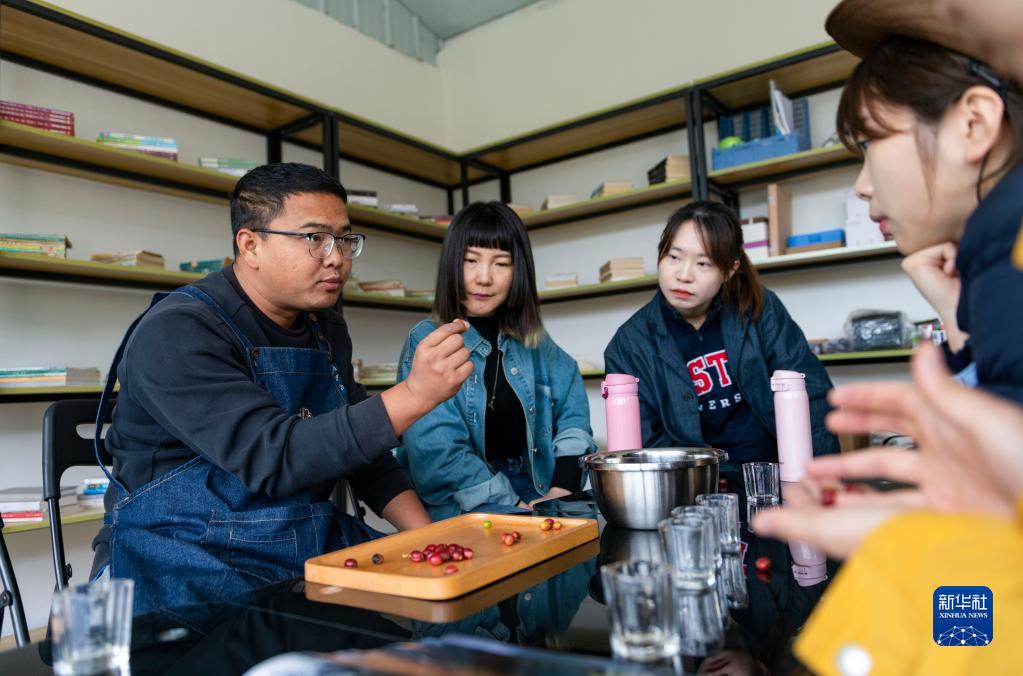 在云南普洱市思茅區野鴨塘河谷咖啡莊園內,楊鴻簡(左一)在給一群年輕人介紹咖啡知識(2月23日攝)。新華社記者 陳欣波 攝