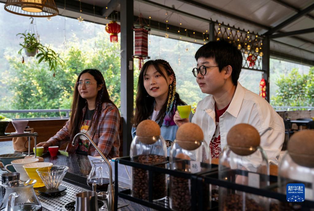 游客在云南普洱市思茅區小凹子咖啡莊園內品嘗咖啡(2月22日攝)。新華社記者 陳欣波 攝