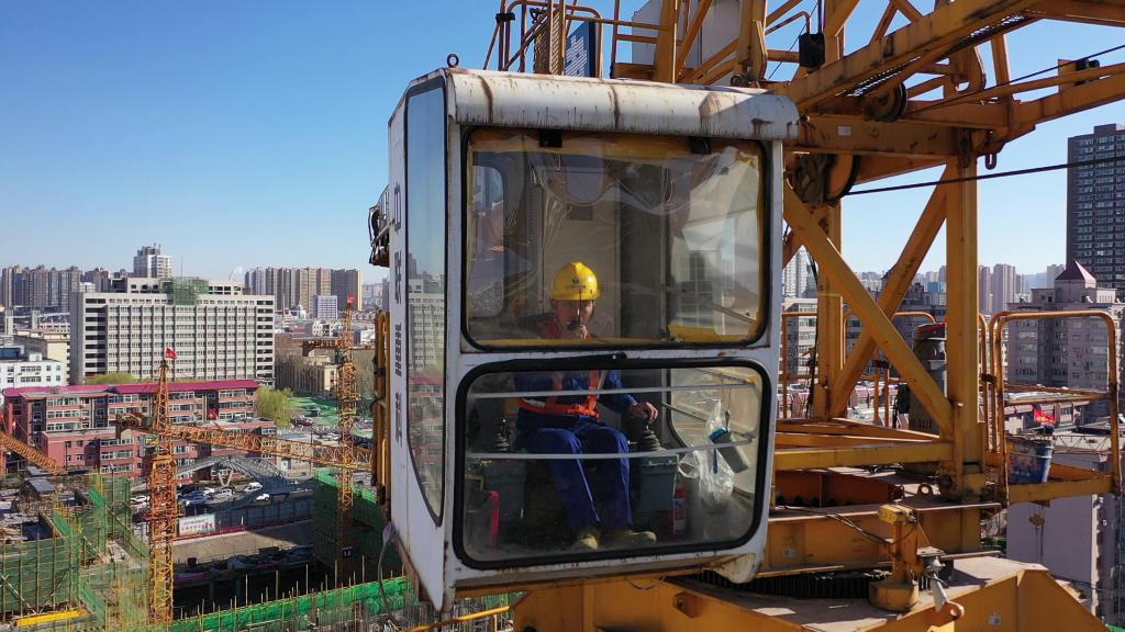 吉克達富正在觀察班組內的塔式起重機。新華社記者李紫薇 攝(2022年3月21日)