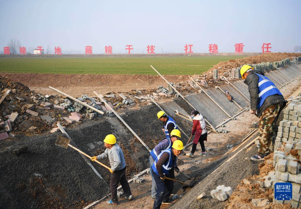在河南省鶴壁市??h30萬畝高標準農田示范方內,施工人員在修復去年水毀的溝渠(2月24日攝)。新華社記者 張浩然 攝