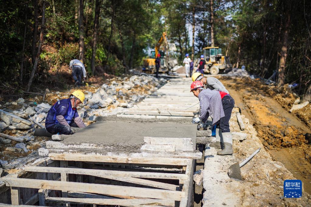 工人在貴州省惠水縣雅水鎮修建農村水渠(3月16日攝)。新華社記者 陶亮 攝