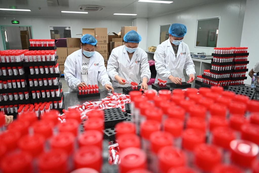 3月16日,位于廈門生物醫藥產業園的美林美邦(廈門)生物科技有限公司員工在包裝一次性病毒采樣管。 新華社記者 林善傳 攝