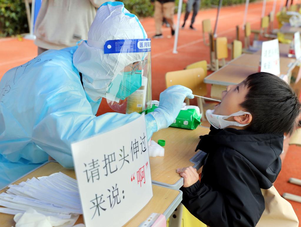 檢測人員為上??党蔷用襁M行核酸采樣(新華社記者劉穎攝)