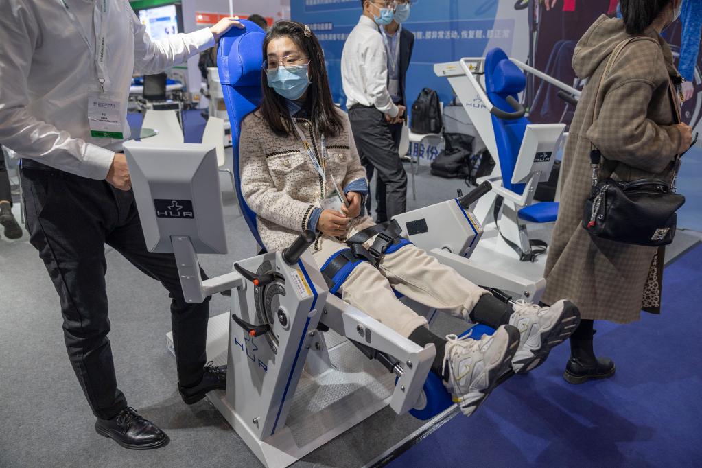2021年10月16日,觀眾在中國國際福祉博覽會上體驗一款智能物聯網長者運動康復系統。新華社記者 才揚 攝