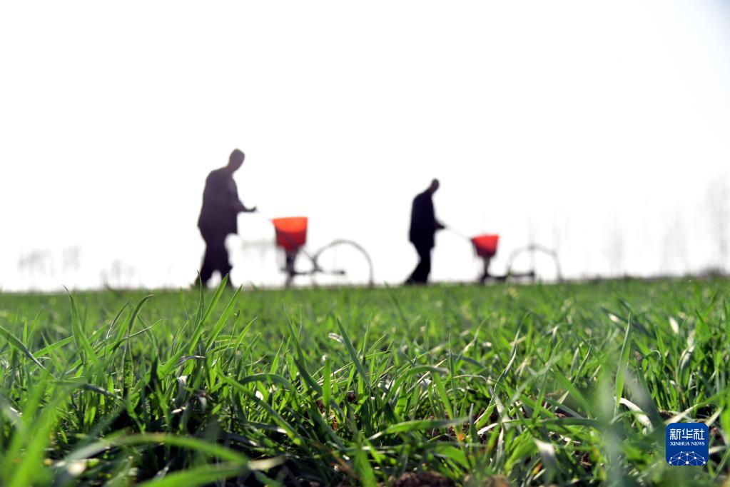 3月14日,在山東省聊城市茌平區胡屯鎮,農民給麥田追肥?!⌒氯A社發(趙玉國 攝)