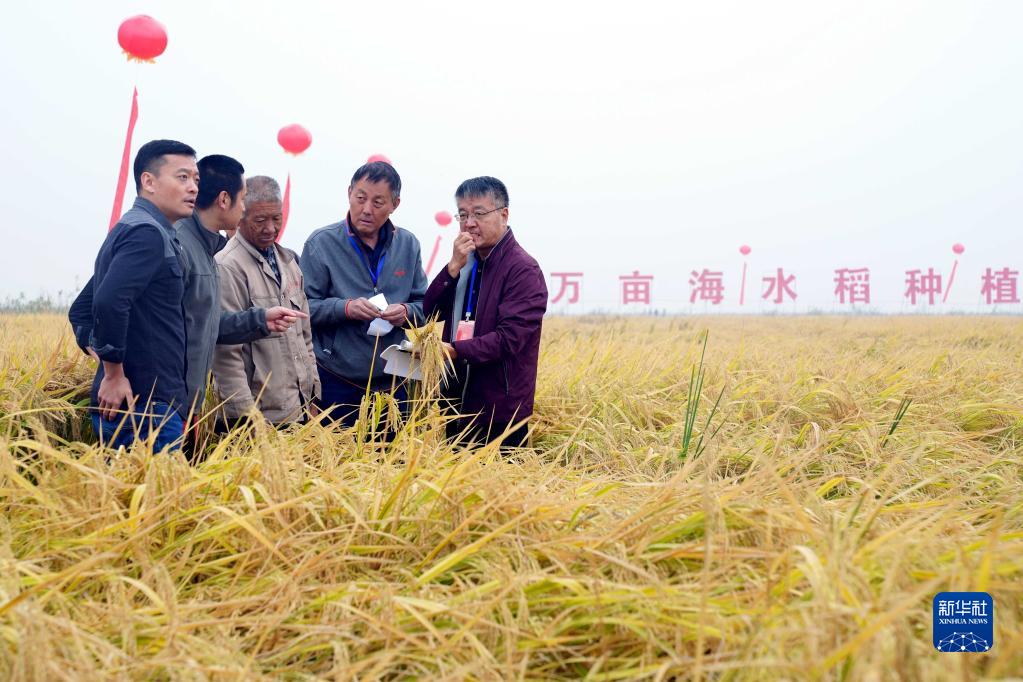 在山東濰坊市寒亭區海水稻三產融合示范基地,專家組成員在進行測產(2020年10月16日攝)?!⌒氯A社記者 郭緒雷 攝