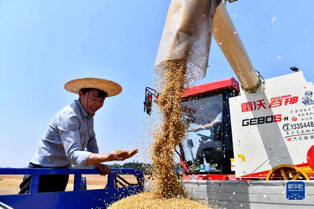 在山東滕州市官橋鎮,農民查看新收獲小麥的質量情況(2021年6月4日攝)?!⌒氯A社記者 郭緒雷 攝