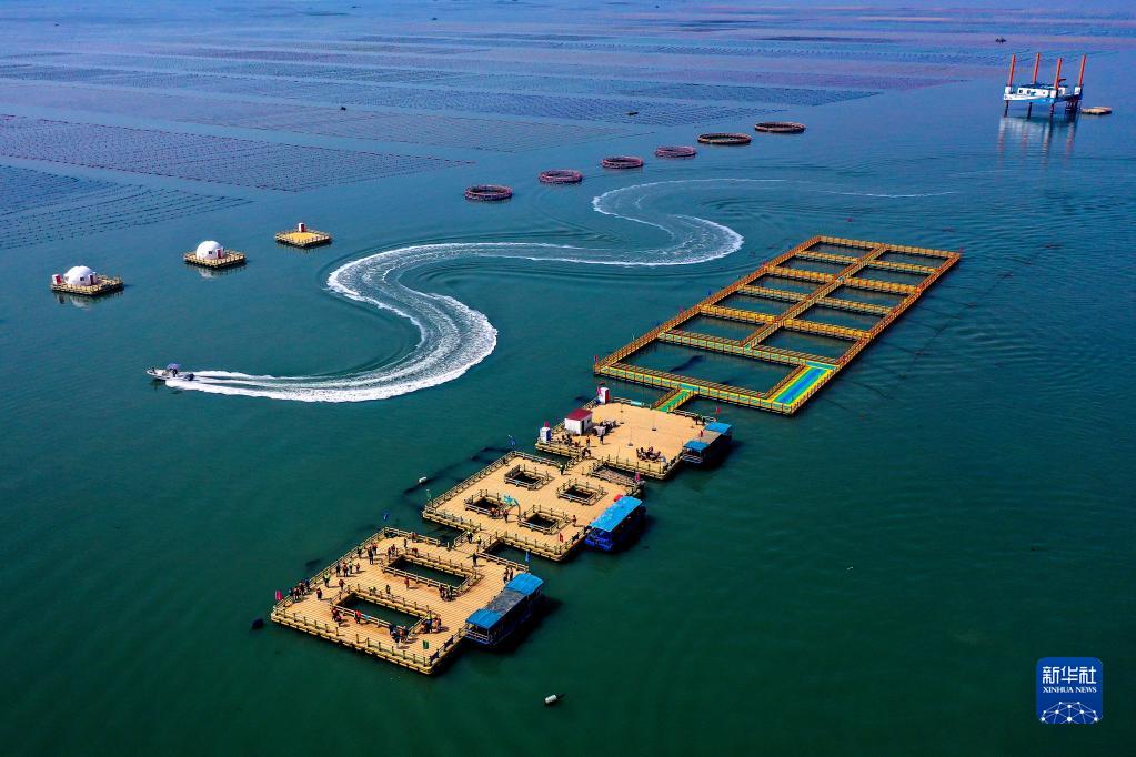 在山東榮成愛倫灣國家級海洋牧場,游客乘坐游船前往海上觀光平臺游玩(2021年4月11日攝,無人機照片)?!⌒氯A社發(李信君 攝)