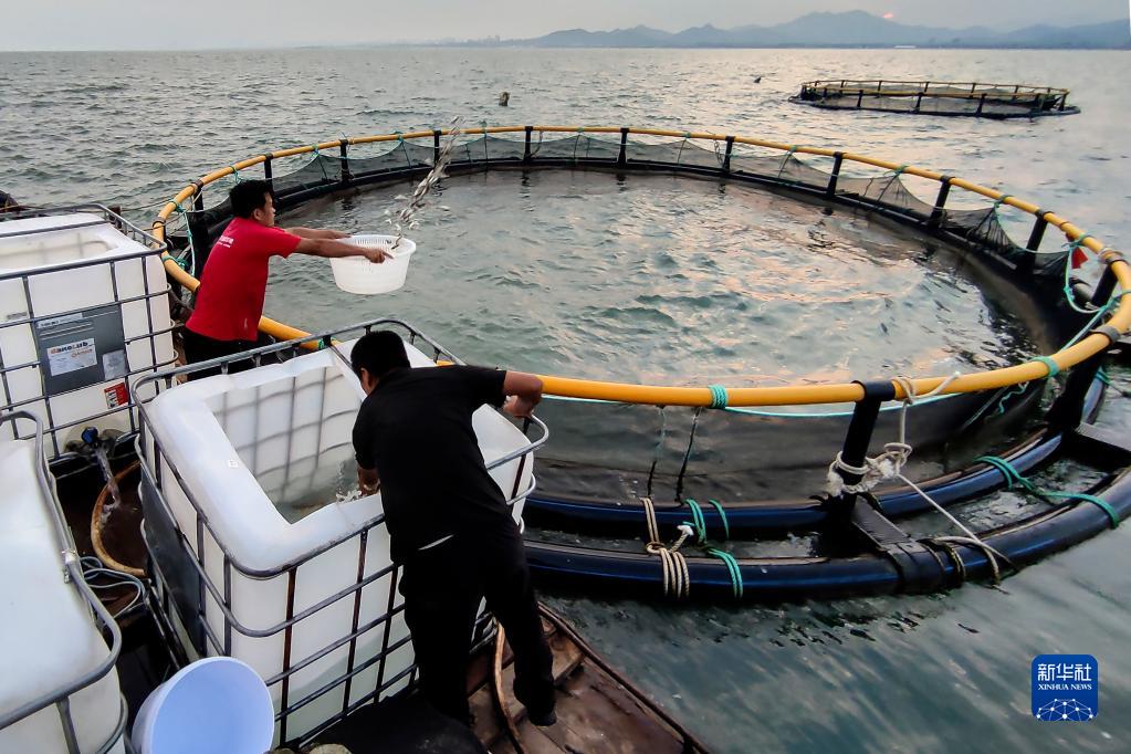在山東日照市一個海洋牧場,工作人員往養殖網箱投放魚苗(2020年9月9日攝)?!⌒氯A社發(房紅金 攝)