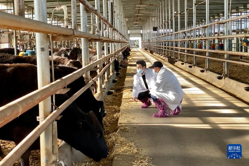 在黑龍江省龍江縣的和?,F代化繁殖基地,工作人員查看和牛生長狀況(2020年12月3日攝)?!⌒氯A社記者 劉赫垚 攝
