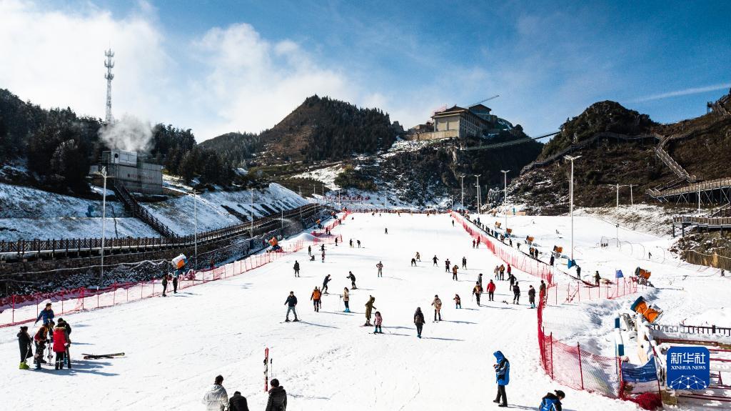 游客在六盤水市梅花山國際滑雪場享受滑雪樂趣(2019年1月16日攝,無人機照片)。新華社記者 陶亮 攝