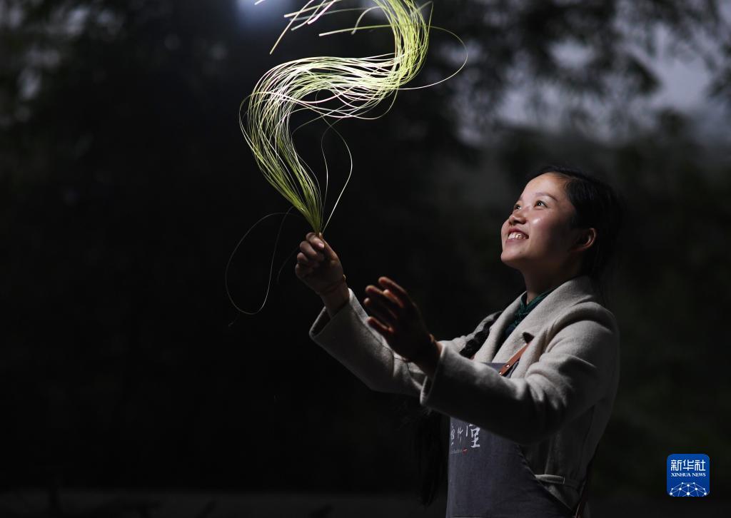 在貴州赤水市大同鎮民族村,楊昌芹在非遺“赤水竹編”培訓基地展示新制作的竹絲(2019年11月11日攝)。新華社記者 楊文斌 攝