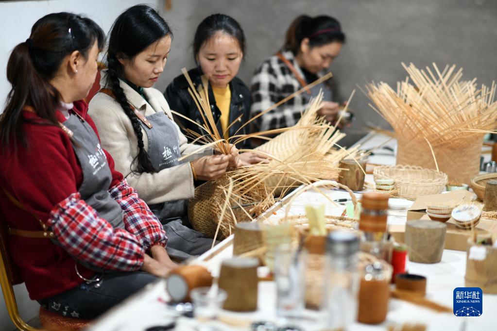 楊昌芹(左二)在非遺“赤水竹編”培訓基地指導工人學習竹編(2019年11月11日攝)。新華社記者 楊文斌 攝