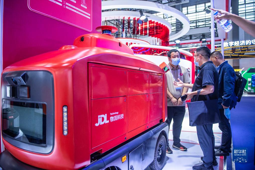 參會者在2021中國國際大數據產業博覽會上了解無人駕駛快遞運輸車(2021年5月26日攝)。新華社記者 陶亮 攝