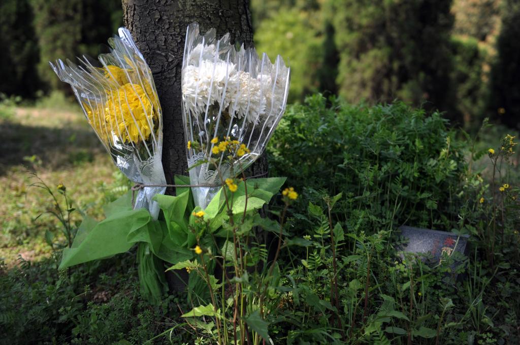 親友擺放鮮花祭奠在浙江安賢陵園樹葬的逝者。新華社記者黃宗治攝