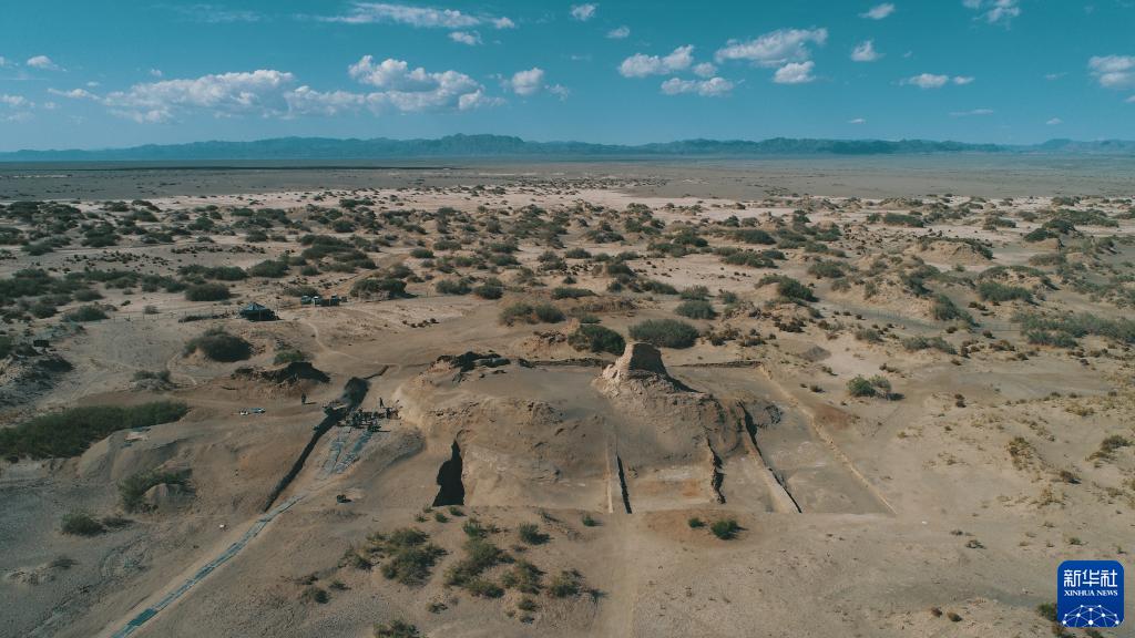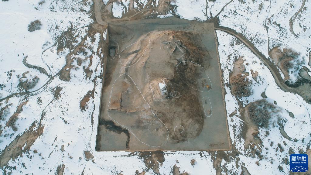 俯瞰克亞克庫都克烽燧發掘現場(2021年12月11日攝,無人機照片)。新華社發(胡興軍 攝)