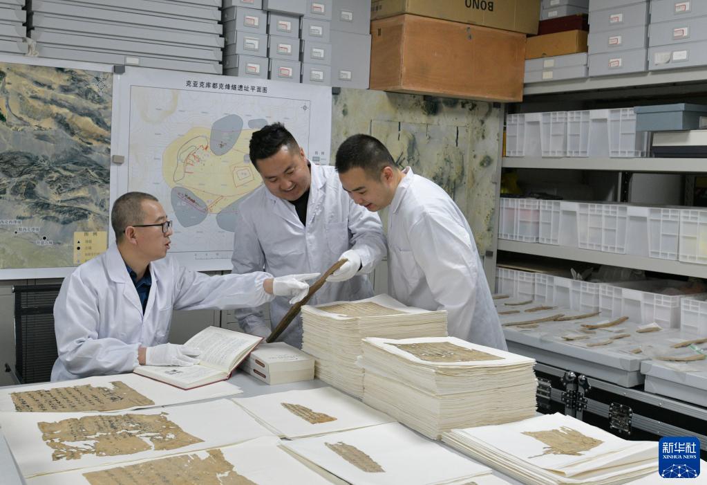 新疆文物考古研究所研究館員胡興軍(左一)與隊員整理出土文書(資料照片)。新華社發(劉玉生 攝)