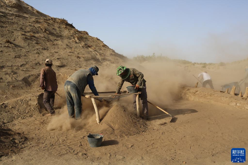 考古工作隊成員在克亞克庫都克烽燧遺址開展挖沙、篩沙工作(資料照片)。新華社發(胡興軍 攝)