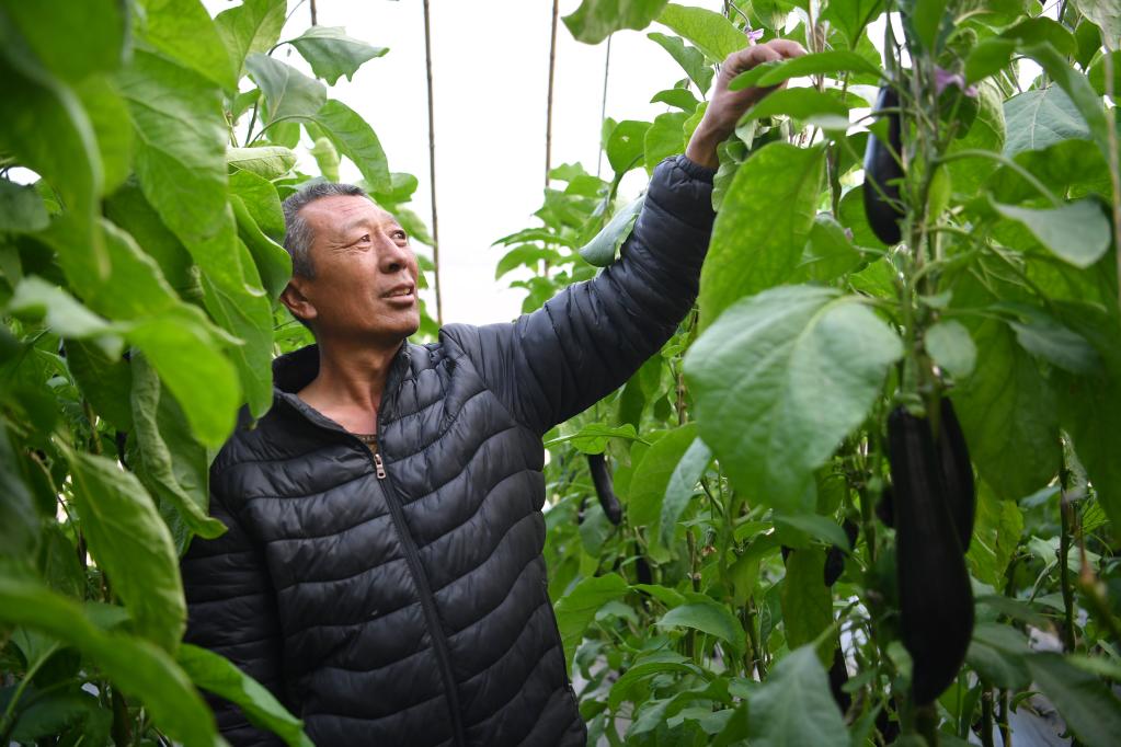 春耕時節,延安市安塞區化子坪鎮張岔村村民王慶平在大棚內給茄子掐尖。新華社記者邵瑞 攝