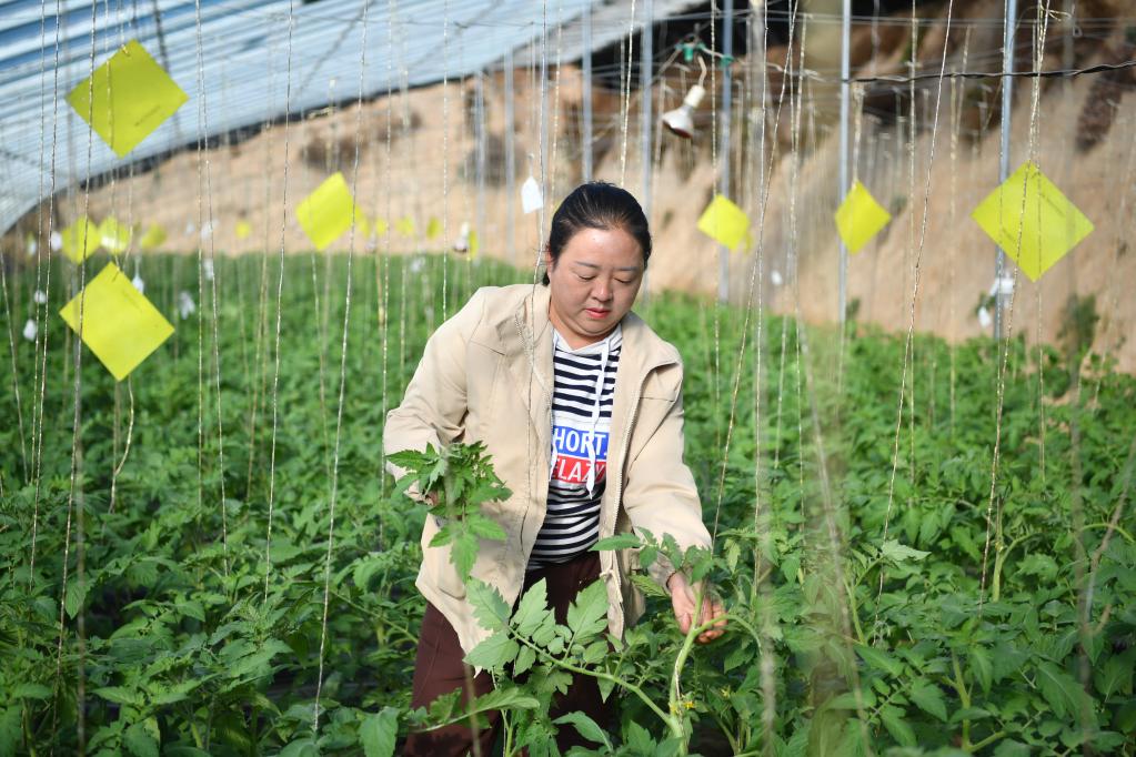 4月2日,延安市宜川縣丹州街道王灣村村民張榮在對西紅柿進行疏枝。新華社記者邵瑞 攝